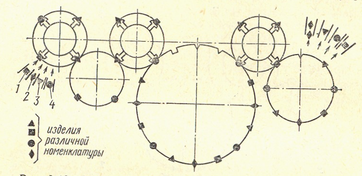 Схема такой многономенклатурной роторной линии показана на рис. 4. Наиболее успешно на этих линиях осуществляются штамповочные, вытяжные, сборочные и контрольные операции.