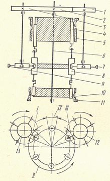 На рис. 2 показана схема работы роторной машины системы Кошкина. Заготовка в зоне I подается в рабочий ротор, закрепленный на валу 6, транспортным питающим ротором 13 при его непрерывном вращении, В зоне I при вращении рабочего ротора заготовка обрабатывается, и в зоне III деталь снимается транспортным ротором 12 посредством несущих органов 7. Несущие органы 7 и 9 приводятся во вращение зубчатыми колесами 3, 2, 1.