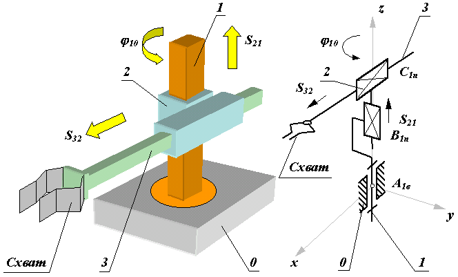 Рассмотрим для примера структурную и функциональную схемы промышленного робота с трехподвижным манипулятором. Основной механизм руки манипулятора состоит из неподвижного звена 0 и трех подвижных звеньев 1, 2 и 3 (рис.1.1).