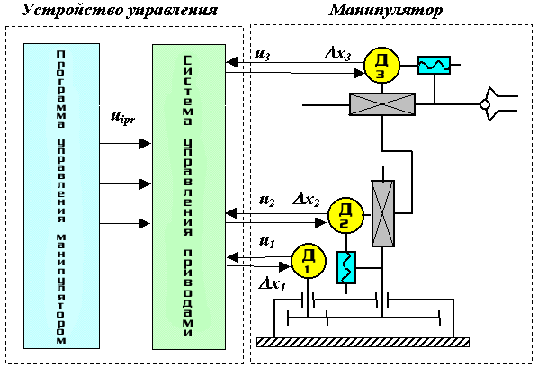 Механизм этого манипулятора соответствует цилиндрической системе координат. В этой системе звено 1 может вращаться относительно звена 0 (относительное угловое перемещение 10), звено 2 перемещается по вертикали относительно звена 1 (относительное линейное перемещение S21) и звено 3 перемещается в горизонтальной плоскости относительно звена 2 (относительное линейное перемещение S32). На конце звена 3 укреплено захватное устройство или схват, предназначенный для захвата и удержания объекта манипулирования при работе манипулятора. Звенья основного рычажного механизма манипулятора образуют между собой три одноподвижные кинематические пары (одну вращательную А и две поступательные В и С) и могут обеспечить перемещение объекта в пространстве без управления его ориентацией. Для выполнения каждого из трех относительных движений манипулятор должен быть оснащен приводами, которые состоят двигателей с редуктором и системы датчиков обратной связии. Так как движение объекта осуществляется по заданному закону движения, то в системе должны быть устройства сохраняющие и задающие программу движения, которые назовем программоносителями. При управлении от ЭВМ такими устройствами могут быть дискеты, диски CD, магнитные ленты и др. Преобразование заданной программы движения в сигналы управления двигателями осуществляется системой управления. Эта система включает ЭВМ, с соответствующим программным обеспечением, цифроаналоговые преобразователи и усилители. Система управления, в соответствии с заданной программой, формирует и выдает на исполнительные устройства приводов (двигатели) управляющие воздействия ui. При необходимости она корректирует эти воздействия по сигналам xi, которые поступают в нее с датчиков обратной связи. Функциональная схема промышленного робота приведена на рис. 1.2.