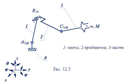 Рассмотрим структурную схему антропоморфного манипулятора, то есть схему которая в первом приближении соответствует механизму руки человека (рис.1.3). Этот механизм состоит из трех подвижных звеньев и трех кинематических пар: двух трехподвижных сферических А3сф и С3сф и одной одноподвижной вращательной В1в .