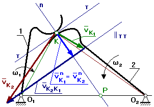 Для того чтобы не было отрыва или внедрения поверхностей звеньев, образующих высшую КП, необходимо, чтобы проекции линейных скоростей взаимодействующих тел на общую нормаль, проведенную в точке контакта тел, были равны.