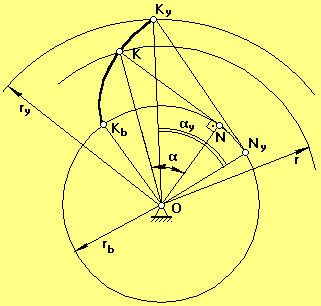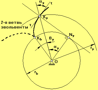 Эвольвента образуется путем перекатывания производящей прямой KyNy без скольжения по основной окружности радиуса rb.