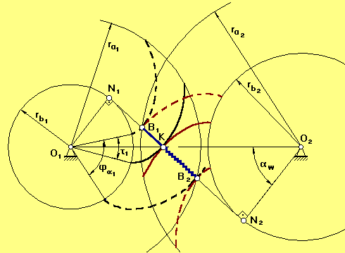 Линия зацепления является геометрическим местом точек контакта сопряженных эвольвентных профилей. В точке В1 пара эвольвент, которые в данный момент времени контактируют в точке К, входят в зацепление. В точке В2 этаже пара эвольвент из зацепления выходят.