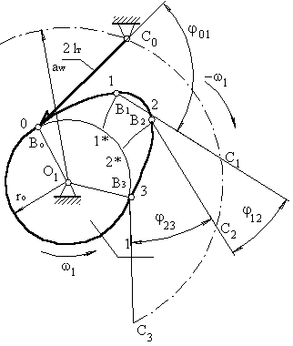 Точка В принадлежит толкателю, который повора - чивается вокруг оси С, т.е. т.В перемещается по дуге окружности радиусом r = lт. Из точки 1 проводим окружность r = lт до пересечения с окружностью, радиус которой равен расстоянию между тО1 и тС: r = aw. Точка пере сечения т.С1 – положение оси вращения толкателя в обращенном движении, когда толкатель контактирует с поверхностью кулачка в