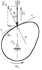 Угол давления – угол между вектором линейной скорости выходного звена (толкателя) и реакцией, действующей с ведущего звена (кулачка) на выходное звено. Эта реакция без учета сил трения направлена по общей нормали к взаимодействующим поверхностям. Угол давления определяется экспериментально. Для кулачкового механизма с поступательно движущимся толкателем допустимый угол давления равен: [θ] = 25º÷35º.