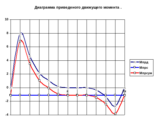 Для исследуемого механизма приведенный суммарной момент состоит из двух составляющих: движущей силы и момента сил сопротивления