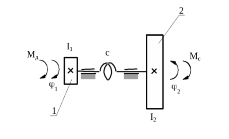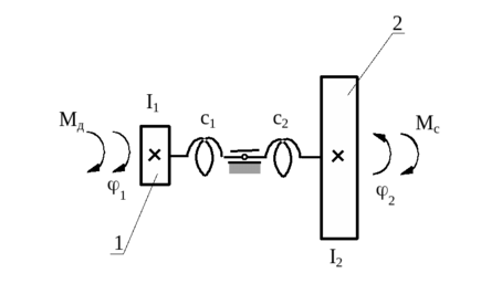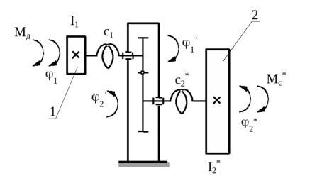 I1 и I2* - моменты инерции соответственно ротора двигателя и исполнительного устройства, с1 и с2* - крутильные жесткости соответственно входного и выходного валов, Мд и Мс - моменты движущих сил и сил сопротивления, угловые координаты: 1 - ротора двигателя, 1 - шестерни редуктора, 2 - колеса редуктора и 2* - исполнительного устройства.