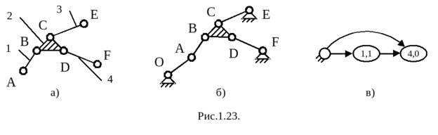 етырехзвенная группа Ассура (N=4) должна содержать 6 низших КП, как, например, на рис. 1.23, а. (рн=6, рв=0, Wпг=34-26=0). Присоединив такую группу к однозвенной одноподвижной группе и к стойке, получим механизм, показанный на рис. 1.23, б. Граф структуры такого механизма представлен на рис. 1.23, в.