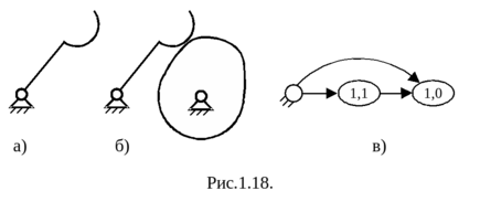 =1, тогда рн=1 и рв=1 (в группе Ассура с одним звеном должна быть одна низшая и одна высшая КП – рис. 1.18, а). Присоединив однозвенную группу Ассура к одноподвижной группе и к стойке, получим механизм с коромысловым толкателем (рис. 1.18, б). Структуру механизма можно представить в виде схемы, называемой графом: вершины графа, обозначаемые кружками, представляют собой структурные группы, внутри которых цифрами проставляют число звеньев группы и число степеней подвижности группы; ребра графа, связывающие вершины, обозначают КП, с помощью которых группы соединяются между собой. Вершина графа с нанесенной косой штриховкой обозначает стойку. Таким образом, граф структуры, изображенный на рис. 1.18, в показывает, что структура механизма представляет собой однозвенную одноподвижную группу, которая связана с однозвенной группой Ассура и со стойкой.