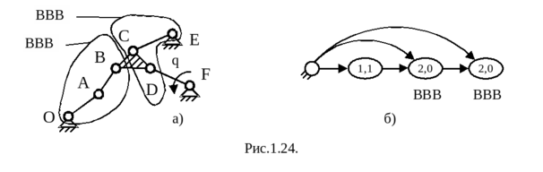 ассмотрим механизм, представленный на рис. 1.24, а. Если в качестве входного звена выбрать звено DF, то весь механизм разобьется на три структурные группы: однозвенную одноподвижную (звено DF со вращательной КП), диаду ВВВ (звенья CD и CE с тремя вращательными КП) и еще одну диаду ВВВ (звенья ОА и АВ с тремя вращательными парами). Граф структуры преобразованного механизма представлен на рис. 1.24, б. В результате структурного преобразования мы условно избавились от громоздкой четырехзвенной группы, заменив ее на две диады.