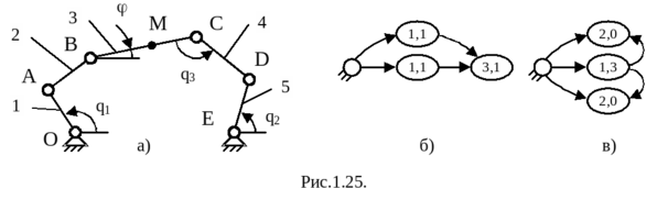 Рассмотрим пример. На рис. 1.25, а представлена схема плоской платформы. Число степеней подвижности по формуле Чебышева Wп=3(6-1)-26=3. Следовательно, в механизме надо задать три входа: q1, q2, q3. В случае, если эти входы заданы так, как показано на рисунке, механизм распадается на следующие структурные группы: две однозвенные одноподвижные (звенья ОА и DE с вращательным КП) и одну трехзвенную одноподвижную (звенья АВ, ВС, CD с четырьмя вращательными КП). Граф структуры такого механизма показан на рис. 1.25, б. Выходными координатами в этом случае являются координаты некоторой точки М