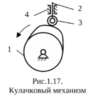Рассмотрим кулачковый механизм, представленный на рис. 1.17. Здесь звено 1 – кулак, звено 2 – толкатель, звено 3 – ролик, 4 – стойка. Ролик в кулачковых механизмах ставится для уменьшения потерь на трение (замена трения скольжения на трение качения). В механизме три низших кинематических пары (две вращательных и одна поступательная) и одна высшая (соединение кулака и ролика). По формуле Чебышева Wп=3(4-1)-23-11=2. Вторая степень подвижности (вращение ролика вокруг своей оси) – «лишняя».