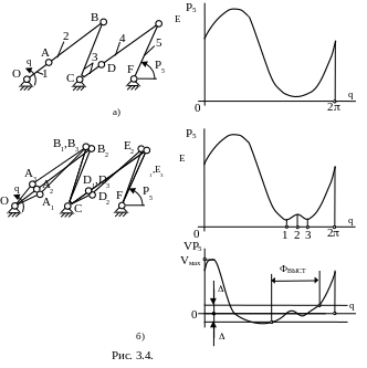 Наиболее просто и точно выстой можно получить с помощью кулачкового механизма. Однако иногда по технологическим условиям требуется использовать рычажный механизм. В этом случае для получения выстоя поступают следующим образом: к кривошипной группе последовательно присоединяют структурные группы Ассура таким образом, чтобы они попадали в крайние положения при близких значениях угла поворота кривошипа. Чем больше структурных групп, тем продолжительнее выстой; чем ближе друг к другу крайние положения структурных групп, тем выстой точнее. На рис. 3.4, а показан шарнирный шестизвенник, у которого диада, состоящая из звеньев 2 и 3, входит в крайнее положение одновременно с диадой, состоящей из звеньев 4 и 5 (шарниры 0АВ лежат на одной прямой, и шарниры CDE тоже на одной прямой). Функция положения P5(q) звена 5 имеет два экстремума: один максимум и один минимум. На рис. 3.4, б показан шестизвенник, у которого за счет увеличения угла BCD диады входят в крайние положения не одновременно. В положении 1 в крайнее положение входит диада, состоящая из звеньев 4 и 5 (шарниры CDE лежат на одной прямой). В положении 2 в крайнее положение входит диада, состоящая из звеньев 2 и 3 (шарниры ABC лежат на одной прямой). В положении 3 в крайнем положении снова оказывается диада, состоящая из звеньев 4 и 5. Функция положения P5(q) звена 5 такого механизма имеет уже 4 экстремума. Углом выстоя ФВЫСТ считается такой угол поворота кривошипа q, при котором скорость VP5 звена 5 не превышает значения , где =