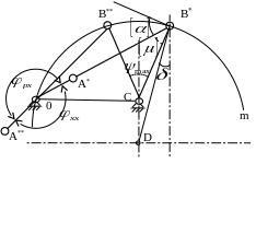 Поскольку число выходных параметров синтеза на единицу больше, чем число входных, то один параметр задается произвольно. Зададимся длиной коромысла l3. Построим в произвольном масштабе коромысло СВ в двух крайних положения: СВ* и СВ** (рис. 3.3’, б). Из точки B* проведем прямую B*D под углом к биссектрисе угла max (угол выражается через коэффициент производительности K – см. соотношение 3.10). Из точки D как из центра проведем дугу окружности m радиуса B*D. Отложим от коромысла CB* минимально допустимый угол передачи