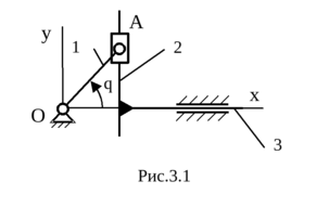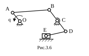 ри проектировании некоторых машин могут предъявляться требованиям к силам инерции. Чаще всего эти силы стремятся уменьшить; в некоторых случаях их увеличивают на рабочем звене для того, чтобы с их помощью преодолеть рабочую нагрузку. О силах инерции подробный разговор будет дальше, при изучении динамики. Здесь можно сказать , что сила инерции пропорциональна ускорению центра масс и, следовательно, аналогу его ускорения. Поэтому при синтезе механизма можно задавать требования к максимальному значению аналога ускорения рабочего звена П”max: либо его минимизация (для уменьшения силы инерции и, следовательно, для уменьшения динамического воздействия на окружающую среду), либо – его увеличение (например, в прессах-пульсаторах ударного действия). Пример механизма с большим значением П”max приведен на рис. 3.6. -