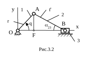 механизме на рис. 3.2 при синтезе надо определить два параметра: длину кривошипа r и длину шатуна l. Следовательно, надо составить два независимых уравнения, связывающих между собой эти параметры и выбранные критерии синтеза.