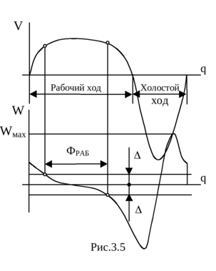 . Расчет этого угла иллюстрируется графиками скорости и ускорения рабочего звена, приведенными на рис. 3.5.