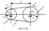 В ременных передачах межосевое расстояние а = О1О2 больше, чем во фрикционных. В передаче, показанной на рис. 3.20, направление вращение у ведущего и ведомого колес совпадает, в отличие от фрикционной передачи, показанной на рис. 3.19.