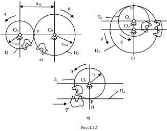 Для того, чтобы уменьшить габариты передачи, используют колеса внутреннего зацепления: одно колесо вставляется внутрь другого (рис. 3.22, б). В этом случае направление вращения ведущего и ведомого колес совпадает, поэтому передаточное отношение – положительное: