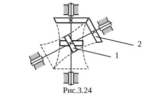 При передаче вращения между валами, оси которых скрещиваются, не существует точки или оси, где относительная скорость была бы равна 0, т.е. нет ни мгновенного центра скоростей в относительном движении, ни мгновенной оси. Относительное движение можно представить как поворот вокруг некоторой оси и скольжение вдоль нее. Эта ось называется мгновенной осью вращения-скольжения или мгновенной винтовой осью. Геометрические места мгновенной винтовой оси на каждом из колес дают винтовые аксоиды относительного движения. При постоянном передаточном отношении мгновенная винтовая ось занимает постоянное положение в неподвижном пространстве, а винтовые аксоиды относительного движения являются однополостными гиперболоидами вращения (рис. 3.24). На этом основании зубчатую передачу со скрещивающимися осями вращения называют гиперболоидной.
