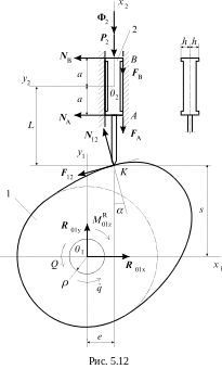 где е – эксцентриситет кулачкового механизма, s – координата толкателя, f – коэффициент трения во вращательной паре, ρ – радиус цапфы вала кулачка. Из уравнений (5.35) можно определить реакции во вращательной паре и движущий момент Q.
