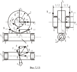 Силовой расчет червячной передачи (рис. 5.13). Червячная передача содержит одну высшую пятиподвижную кинематическую пару, динамическая модель которой представляется уравнениями (5.16), и две вращательные пары. Пренебрежем трением во вращательных парах, поскольку оно обычно оказывается значительно менее существенным, чем трение в червячном зацеплении. Уравнения кинетостатики для червячного колеса и червяка оказываются независимыми. Сначала составим уравнения кинетостатики для червячного колеса. Положим, что оси координат 02xyz являются главными центральными осями инерции колеса. Используем соотношения (5.16). Обозначим: r2 – начальный радиус червячного колеса, J20 – момент инерции колеса относительно оси 02z (точка 02z совпадает с центром масс колеса). Проецируя силы, действующие на колесо, на оси координат 02xyz и составляя уравнения моментов относительно этих осей, получаем систему шести уравнений с шестью неизвестными (NAx, Nay, NCx, NCy, N2z, N12):