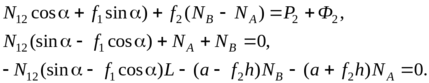 Полагая, что N12 < 0, sinα > f1cosα (сtgα < f1), получаем, действительно, NA > 0, NB < 0. Подставив (5.33) в первое уравнение (5.32), имеем: