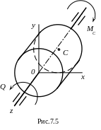 Существует множество машин, в которых единственным подвижным звеном является ротор, совершающий вращательное движение. К ним относятся роторные электродвигатели, насосы, центробежные компрессоры, турбины, центрифуги. Исследуем внешнюю виброактивность ротора (рис.7.5), рассматриваемого как абсолютно твердое тело. Пусть к ротору приложены движущий момент Q и момент сил сопротивления МС; ротор вращается с угловой скоростью и угловым ускорением . Введем систему координат 0хyz, связанную с