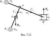 = 0, т.е. центр масс всего механизма должен оставаться неподвижным в процессе движения. В принципе это условие можно выполнить установкой на звеньях механизма дополнительных масс – противовесов. На рис.7.11 показан способ уравновешивания кривошипно-ползунного механизма с помощью двух противовесов, установленных на шатуне и кривошипе. Пусть С1 и С2 – центры масс кривошипа и шатуна; К1 и К2 – центры масс противовесов; В – центр масс ползуна; m1, m2, m3 – массы этих звеньев; ОА = r, АВ = l , АС2 = а2, АК1 = аI, ОК2 = аII, ОС1 = а1. Выбрав массу mI первого противовеса из условия