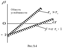 а рис.9.4 представлены области устойчивости системы на плоскости параметров