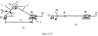 ак уже отмечалось ранее, структура механизма зависит от выбора входа. Условия передачи сил в механизме зависят от структуры и, следовательно, также от выбора входного звена. Рассмотрим теперь ползунно-кривошипный механизм, в котором ползун является входным, а кривошип – выходным звеном (рис. 2.17, а). К кривошипу приложена рабочая нагрузка – момент М. В этом случае, обозначив через q входную координату (