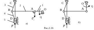 обращается в 0. На рис. 2.16 показана схема пресса в одном из положений, в котором на ползун 5 действует наибольшая рабочая нагрузка Р. В рационально спроектированном механизме (рис. 2.16, а) угол давления в шарнире А наибольший и равен 900, поэтому уравновешивающий момент Q в рамках статической модели равен 0. В неудачно спроектированном механизме (рис. 2.16, б) угол давления в шарнире А наименьший (00), а уравновешивающий момент Q – наибольший.