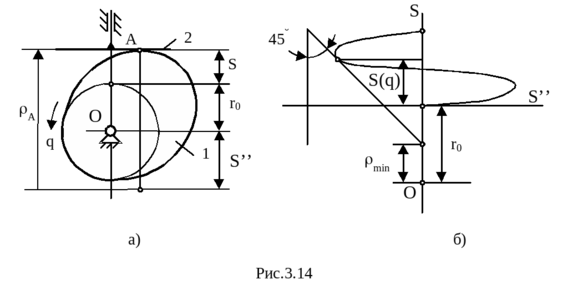 Рассмотрим графический метод. Исключая q из полученных функций s(q) и s’(q), построим в координатах s’01s две кривые, называемые характеристиками угла давления: в первой четверти – для фазы возвращения, а во второй – для фазы удаления (рис. 3.13, б). Отметим, что аналог скорости толкателя s’(q) для вращающегося кулака и поступательно движущегося толкателя измеряется в единицах длины, так же, как и перемещение толкателя s(q). Масштаб по осям s и s’ должен быть одинаковым!