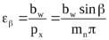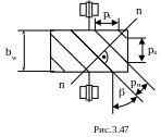 Для прямозубых зубчатых колес обычно < 1,7. Для увеличения коэффициента перекрытия используют косозубые колеса, тогда добавляется коэффициент осевого перекрытия , который может быть вычислен как отношение рабочей ширины венца передачи bw к осевому шагу рх (рис. 3.47):