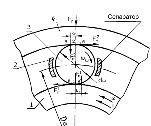 од действием этой силы в местах касания шарика 3 внутреннего и внешнего колец 1 и 4 образуются зоны упругой деформации колец и шарика – пятна контакта радиусом k1 и k2 с центрами в точках 1 и 2. Кольца шарикоподшипника принимаются плоскими, а величина радиуса k одинаковой. В этом случае радиус k представляет собой коэффициент трения качения. При перекатывании шарика в направлении ш нормальные силы Fn1 и Fn2 смещаются в точки б и в, т.е. на величину радиусов k. Так в первом приближении создаётся одна из составляющих момента сопротивления вращению - момент трения качения одного шарика, равный сумме произведений Fn1k и Fn2k. Учитывая, что количество шариков i и нагрузка на них распределяется неравномерно и существует ещё много других составляющих момента сопротивления вращению. На практике для определения момента сопротивления вращению, вызываемого радиальной и осевой силами нагрузки пользуются эмпирическими формулами, которые дают приближённое (осредненное) значение момента сопротивления вращению.Т=Тo+(1,25 Fr+1,5 Fa) fk Do/dш , (1)