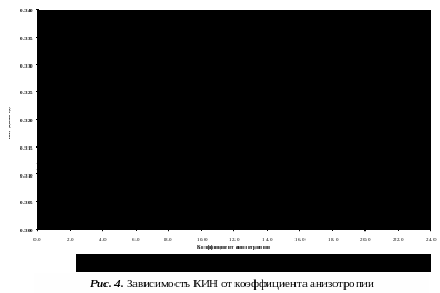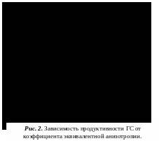 оэффициент эквивалентной анизотропии – это интегральный параметр, учитывающий: а) отличие горизонтальной и вертикальной проницаемости пласта (анизотропию), б) физические процессы, происходящие в зоне дренирования горизонтальной скважины (аналог скин-эффекта), в) особенности фильтрации пластовых флюидов к ГС. На рис. 2 представлены результаты расчетов по оценке влияния коэффициента анизотропии пласта по проницаемости на коэффициент продуктивности ГС.