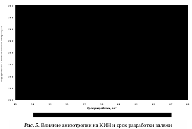 Видно, что увеличение коэффициента анизотропии от 3,2 до 10,0 уменьшает продуктивность горизонтальных скважин в 1,7 раза, а его увеличение до 22,4 – в 2,5 раза по сравнению с результатом расчета при анизотропии 3,2.