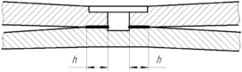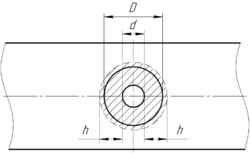 а) поперечное сечение; б) вид сверху. h – размер периферийной зоны; d – диаметр рабочей части инструмента; D – диаметр опорного бурта инструмента.