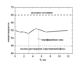 С целью оценки влияния термомеханического цикла ТСТ на структуру и свойства основного металла проводилось исследование микроструктуры и микротвердости. Исследования микроструктуры показали равномерное распределение наряду с частичным растворением вторичной упрочняющей фазы Mg2Si Измерения микротвердости проводились на микрошлифе в поперечном сечении сварной точки. Диаграмма распределения микротвердости по сечению сварного соединения приведена на рис. 11. Полученная диаграмма показывает, что в процессе ТСТ по выбранному режиму не происходит катастрофического падения микротвердости до 45 единиц (соответствующего практически полному растворению вторичной фазы), не наблюдается неоднородности свойств по сечению пластины. Механические свойства после сварки остаются на достаточно высоком уровне, в полном соответствии с исследованиями проведенными в главе 4.