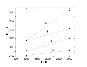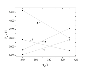 | Рис. 10. Влияние начальной температуры на прочность сварной точки: 1 – F = 1 000 Н, t = 5 c; 2 – F = 3 000 Н, t = 5 c; 3 – F = 3 000 Н, t = 30 c; 4 – F = 1 000 Н, t = 30 c |