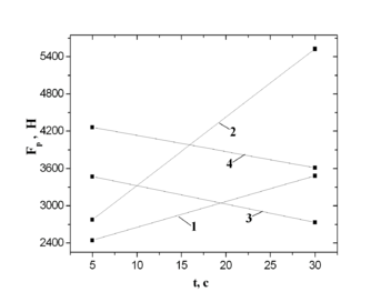 | Рис.8. Влияние времени выдержки на прочность сварной точки: 1 – F = 1 000 Н, T = 340°C; 2 – F = 3 000 Н, T = 340 °C; 3 – F = 1 000 Н, T = 410 °C; 4 – F = 3 000 Н, T = 410 °C |