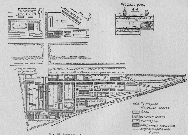 1 – инструментальный цех; 2 – ремонтно-механический цех; 3 – сборочный цех; 4 – механический цех; 5 – трубонарезной цех; 6 – кузнечный цех; 7 – склад металла; 8 – цех металлоконструкций; 9 – литейный цех; 10 – склад шихты; 11 – деревообрабатывающий цех; 12 – модельно-столярный цех; 13 – склад моделей; 14 – главная контора; 15 – охрана и медицинский пункт; 16 – лаборатория; 17 – спортивная площадка; 18 – жилые дома.