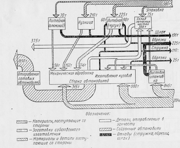 Рис. 8. Схема грузопотоков автомобильного завода (цифры указывают количество перемещаемых грузов в сутки).
