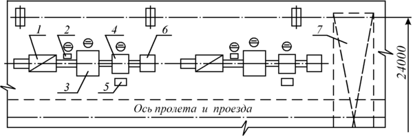 Рис.9. Продольное расположение линий на базе КГШП в однопролетном здании: 1 – индукционный нагреватель; 2 – ковочные вальцы; 3 – КГШП; 4 – обрезной пресс; 5 – тара для облоя; 6 – тара для поковок; 7 – мостовой кран.