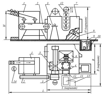 Рис.13. Планировка (компоновка) линии горячей штамповки на ГКМ поковок с длинной осью: 1 – индуктор; 2 – конвейер; 3 – стол; 4 – штамп; 5 – боковой ползун; 6 – главный ползун;7 – ГКМ; 8 – склиз; 9 – тара; 10 – приямок; 11 – индуктор с автозагрузкой; 12 – клещи-перекладчик; 13 – загрузочное автоматическое устройство; 14 – рабочий.