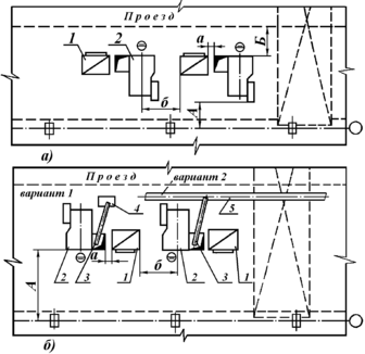 Рис. 12. Схемы линий на базе ГКМ: а – фронт работы от проезда; б – фронт работы от стены или колонн; вариант 1 – сбор поковок в тару; вариант 2 – сбор поковок на общий пластинчатый транспортер; 1 – нагревательная печь (если заготовки мерной длины – индукционный нагреватель); 2 – ГКМ; 3 – транспортер; 4 – тара; 5 – пластинчатый транспортер.