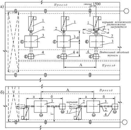 Рис.10. Схемы линий на базе КГШП: а – при поперечном расположении линий в пролете; б – при продольном расположении линий в пролете; 1 – индукционный нагреватель; 2 – транспортер; 3 – КГШП; 4 – обрезной пресс.