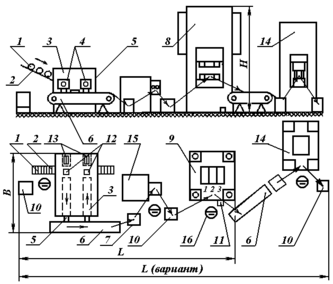 На рис.12 представлены схемы линий на базе ГКМ [1]. Около ГКМ с вертикальным разъемом матриц нагревательную установку следует размещать справа, а не слева, чтобы рабочему не приходилось делать лишних поворотов при подаче нагретых заготовок (прутков) в ГКМ. В определенных условиях возможен вариант размещения нагревательной установки слева.