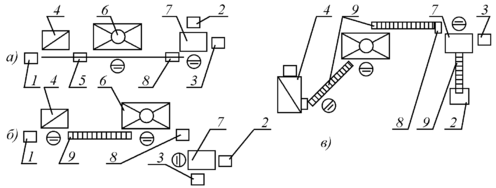 Рис.14. Схемы планировки оборудования и рабочих мест у паровоздушного штамповочного молота: а – в линию, б – с расположением обрезного пресса под углом, в – с расположением печи и обрезного пресса под углом; 1 – тара для заготовок; 2 – тара для поковок; 3 – тара для отходов; 4 – печь; 5 – монорельс с электроталью; 6 – молот; 7 – обрезной пресс; 8 – тара для поковок перед обрезкой облоя; 9 – транспортер.